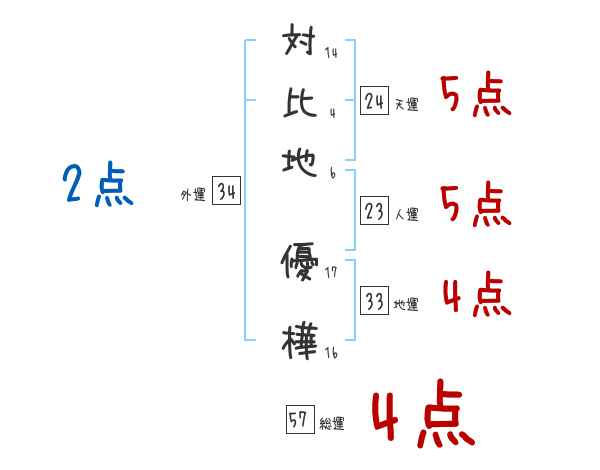 外運![]() | 対比地優樺さんの外運は34画の2つ星!独創性に優れるが、自尊心が強く災難に注意しましょう。 生活面を象徴する運勢です。外部から受ける影響力を表し、結婚運、家庭運や職場、環境への順応性を表します。 |