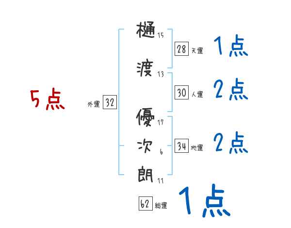 外運![]() | 樋渡優次朗さんの外運は32画の5つ星!柔軟性があり成功する。チャンスが多く金運が良い。 生活面を象徴する運勢です。外部から受ける影響力を表し、結婚運、家庭運や職場、環境への順応性を表します。 |