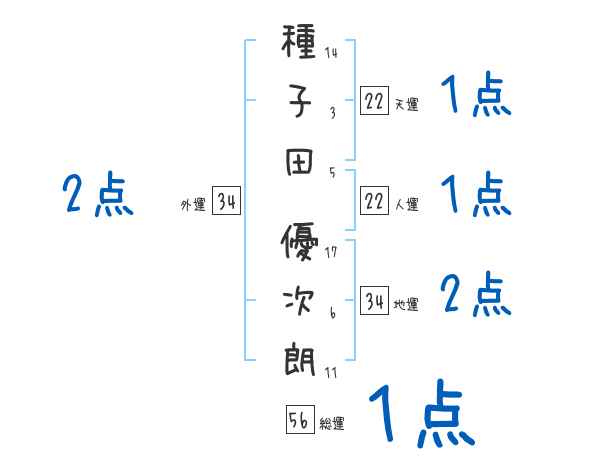外運![]() | 種子田優次朗さんの外運は34画の2つ星!独創性に優れるが、自尊心が強く災難に注意しましょう。 生活面を象徴する運勢です。外部から受ける影響力を表し、結婚運、家庭運や職場、環境への順応性を表します。 |