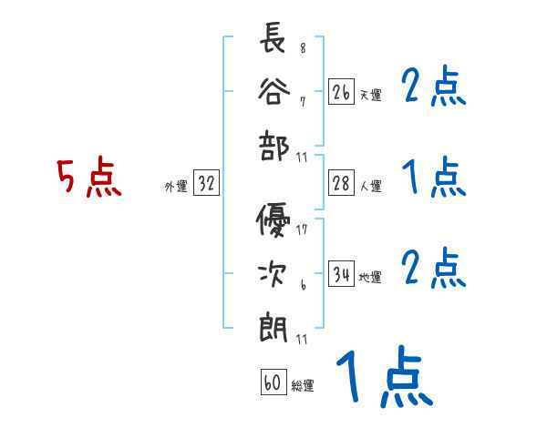 外運![]() | 長谷部優次朗さんの外運は32画の5つ星!柔軟性があり成功する。チャンスが多く金運が良い。 生活面を象徴する運勢です。外部から受ける影響力を表し、結婚運、家庭運や職場、環境への順応性を表します。 |
