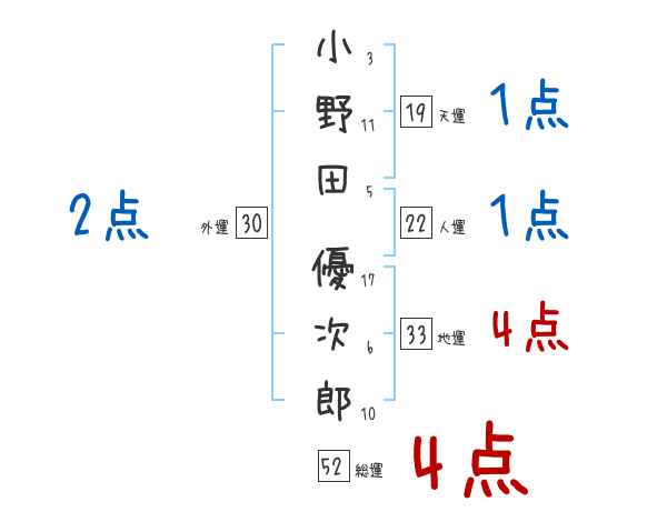 地運![]() | 小野田優次郎さんの地運は33画の4つ星!権力志向でプライドが高い。勇気があり運を切り開き成功する。 個性を表す基礎的な運勢です。性格形成や対人関係、行動力など家庭環境に影響されます。主に誕生してから20歳くらいまでの若年期の運勢を表します。 |