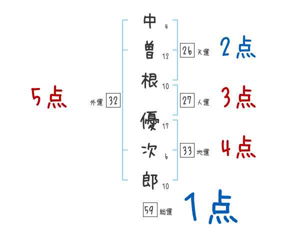 外運![]() | 中曽根優次郎さんの外運は32画の5つ星!柔軟性があり成功する。チャンスが多く金運が良い。 生活面を象徴する運勢です。外部から受ける影響力を表し、結婚運、家庭運や職場、環境への順応性を表します。 |