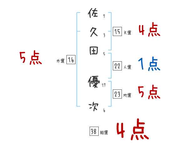 外運![]() | 佐久田優次さんの外運は16画の5つ星!人望が厚く大きく発展する。逆転成功が見える。 生活面を象徴する運勢です。外部から受ける影響力を表し、結婚運、家庭運や職場、環境への順応性を表します。 |