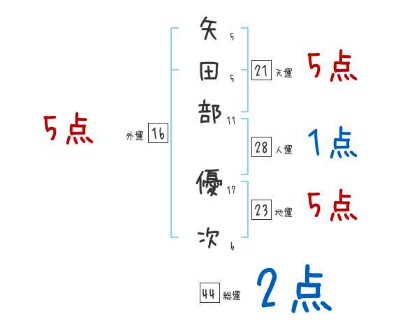 外運![]() | 矢田部優次さんの外運は16画の5つ星!人望が厚く大きく発展する。逆転成功が見える。 生活面を象徴する運勢です。外部から受ける影響力を表し、結婚運、家庭運や職場、環境への順応性を表します。 |