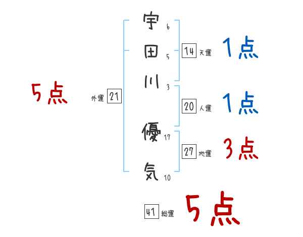 天運![]() | 宇田川優気さんの天運は14画の1つ星!人に対して優しいがストレスを溜め込みがち。人間関係のトラブルを避けるよう気をつけましょう。 家系が持つ宿命的な運勢を表します。祖先から受け継いだ苗字ですので自分の力が及びません。家柄を象徴します。 |