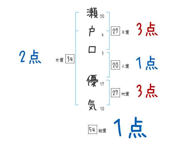 天運![]() | 瀬戸口優気さんの天運は27画の3つ星!頭脳明晰だが強情で摩擦が多い傾向。孤立に注意。 家系が持つ宿命的な運勢を表します。祖先から受け継いだ苗字ですので自分の力が及びません。家柄を象徴します。 |