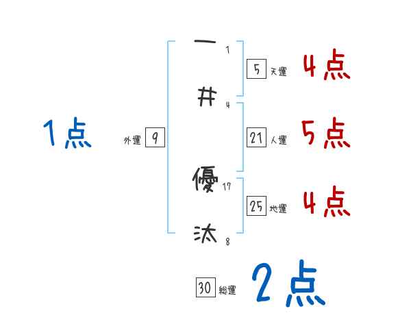 総運![]() | 一井優汰さんの総運は30画の2つ星!浮き沈みの激しさに注意しましょう。 あなたの人生を表す1番重要な運勢です。生涯を通じて影響する総合運となり、主に50歳以降の晩年期に影響を及ぼします。 |