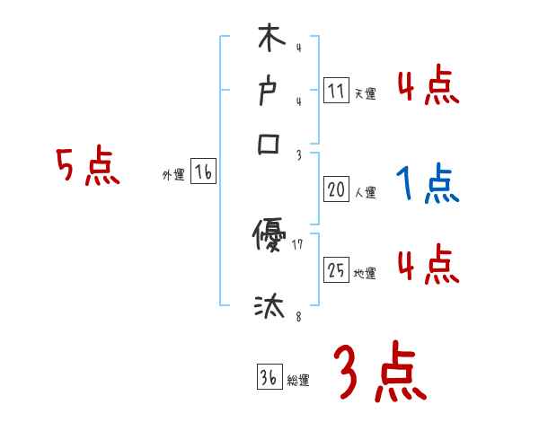 総運![]() | 木戸口優汰さんの総運は36画の3つ星!先見性が豊かです。多少神経質で苦労することも。 あなたの人生を表す1番重要な運勢です。生涯を通じて影響する総合運となり、主に50歳以降の晩年期に影響を及ぼします。 |