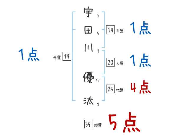 外運![]() | 宇田川優汰さんの外運は19画の1つ星!優れた才能を持ちますが、協調性が足りないことも。周りの人と協力する事を意識しましょう。 生活面を象徴する運勢です。外部から受ける影響力を表し、結婚運、家庭運や職場、環境への順応性を表します。 |