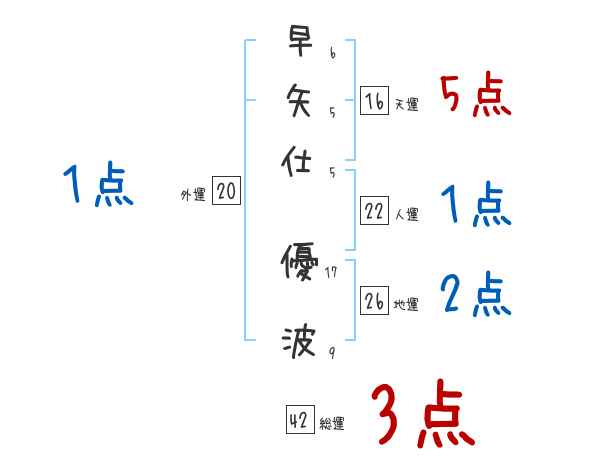 人運![]() | 早矢仕優波さんの人運は22画の1つ星!努力することが苦手ないっぽう手先が器用。芸術性にも優れる。 性格や才能などを表す2番目に重要な運勢です。人間関係や協調性、社会的な成功に影響します。主に20歳から50歳ぐらいまでの中年期の運勢を表します。 |