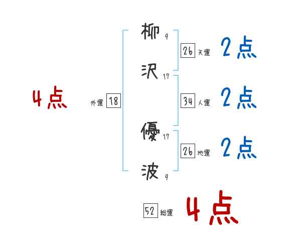外運![]() | 柳沢優波さんの外運は18画の4つ星!情熱的で剛気。忍耐力があり信頼される。 生活面を象徴する運勢です。外部から受ける影響力を表し、結婚運、家庭運や職場、環境への順応性を表します。 |