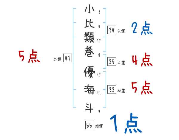 総運![]() | 小比類巻優海斗さんの総運は66画の1つ星!迷うことが多く挫折しやすい傾向が。辛抱強く物事に取り組みましょう。 あなたの人生を表す1番重要な運勢です。生涯を通じて影響する総合運となり、主に50歳以降の晩年期に影響を及ぼします。 |