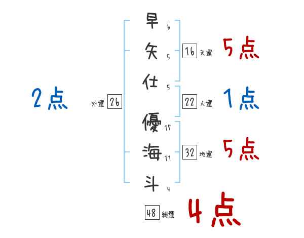 天運![]() | 早矢仕優海斗さんの天運は16画の5つ星!人望が厚く大きく発展する。逆転成功が見える。 家系が持つ宿命的な運勢を表します。祖先から受け継いだ苗字ですので自分の力が及びません。家柄を象徴します。 |