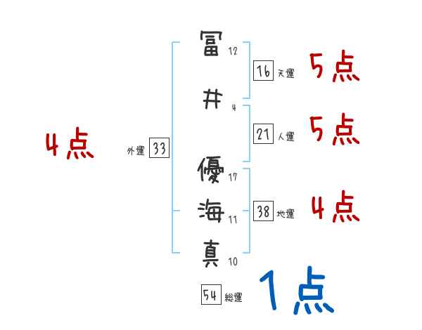 天運![]() | 冨井優海真さんの天運は16画の5つ星!人望が厚く大きく発展する。逆転成功が見える。 家系が持つ宿命的な運勢を表します。祖先から受け継いだ苗字ですので自分の力が及びません。家柄を象徴します。 |