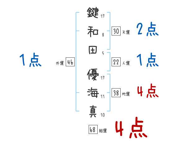 天運![]() | 鍵和田優海真さんの天運は30画の2つ星!浮き沈みの激しさに注意しましょう。 家系が持つ宿命的な運勢を表します。祖先から受け継いだ苗字ですので自分の力が及びません。家柄を象徴します。 |
