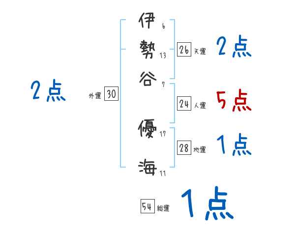天運![]() | 伊勢谷優海さんの天運は26画の2つ星!波瀾万丈かも。信頼できる人を大事にしましょう。 家系が持つ宿命的な運勢を表します。祖先から受け継いだ苗字ですので自分の力が及びません。家柄を象徴します。 |
