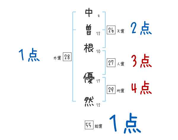天運![]() | 中曽根優然さんの天運は26画の2つ星!波瀾万丈かも。信頼できる人を大事にしましょう。 家系が持つ宿命的な運勢を表します。祖先から受け継いだ苗字ですので自分の力が及びません。家柄を象徴します。 |