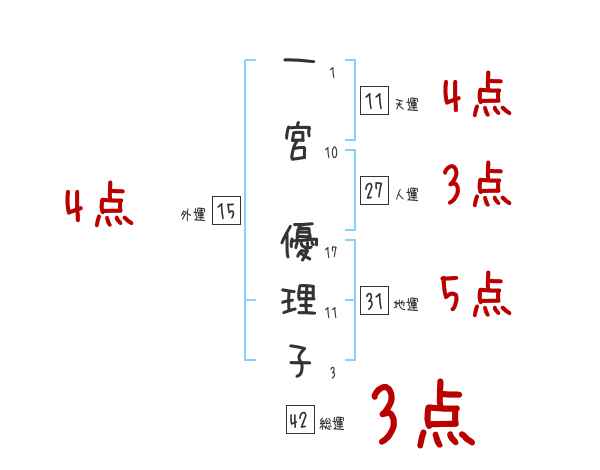 天運![]() | 一宮優理子さんの天運は11画の4つ星!着実に富や地位を得る幸運な人生。 家系が持つ宿命的な運勢を表します。祖先から受け継いだ苗字ですので自分の力が及びません。家柄を象徴します。 |