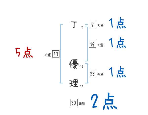 天運![]() | 丁優理さんの天運は2画の1つ星!優しいですが積極性や意思の強さに欠ける傾向があります。家庭環境の乱れに注意しましょう。 家系が持つ宿命的な運勢を表します。祖先から受け継いだ苗字ですので自分の力が及びません。家柄を象徴します。 |