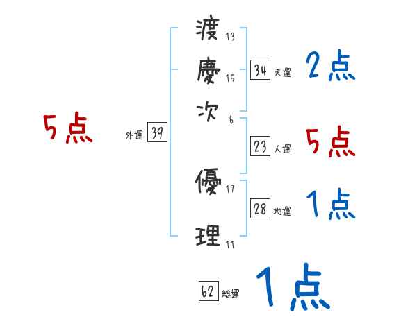 外運![]() | 渡慶次優理さんの外運は39画の5つ星!社交性に優れ人望が厚い。人の上に立ち成功する。 生活面を象徴する運勢です。外部から受ける影響力を表し、結婚運、家庭運や職場、環境への順応性を表します。 |