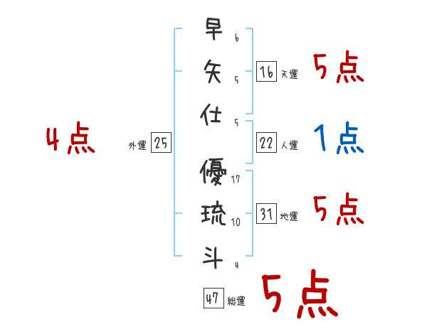 天運![]() | 早矢仕優琉斗さんの天運は16画の5つ星!人望が厚く大きく発展する。逆転成功が見える。 家系が持つ宿命的な運勢を表します。祖先から受け継いだ苗字ですので自分の力が及びません。家柄を象徴します。 |