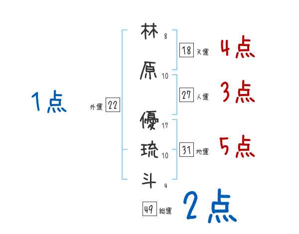 天運![]() | 林原優琉斗さんの天運は18画の4つ星!情熱的で剛気。忍耐力があり信頼される。 家系が持つ宿命的な運勢を表します。祖先から受け継いだ苗字ですので自分の力が及びません。家柄を象徴します。 |
