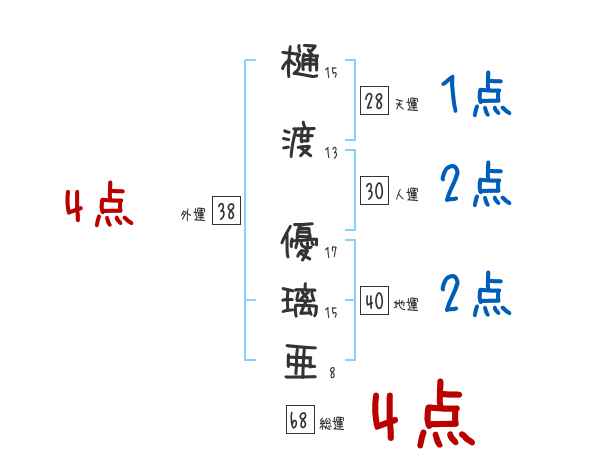 外運![]() | 樋渡優璃亜さんの外運は38画の4つ星!温厚な性格で技術的な才能を発揮する。職人的な仕事に向いている。 生活面を象徴する運勢です。外部から受ける影響力を表し、結婚運、家庭運や職場、環境への順応性を表します。 |