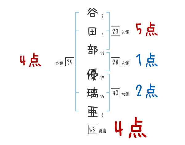総運![]() | 谷田部優璃亜さんの総運は63画の4つ星!家庭運がよく順調な生活。温和な性格。 あなたの人生を表す1番重要な運勢です。生涯を通じて影響する総合運となり、主に50歳以降の晩年期に影響を及ぼします。 |