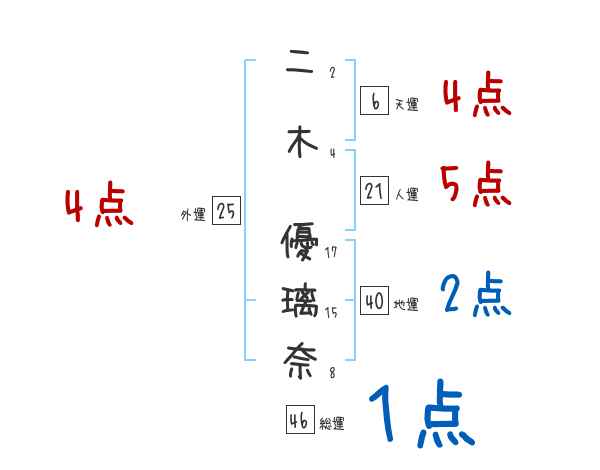 総運![]() | 二木優璃奈さんの総運は46画の1つ星!迷走することが多く苦労するかも。目先のことにとらわれないように。 あなたの人生を表す1番重要な運勢です。生涯を通じて影響する総合運となり、主に50歳以降の晩年期に影響を及ぼします。 |