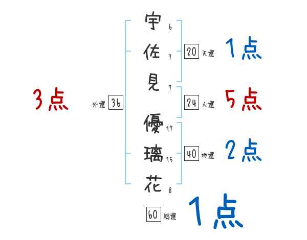 総運![]() | 宇佐見優璃花さんの総運は60画の1つ星!悲観的で迷いやすい。波乱が多く損をしないように。 あなたの人生を表す1番重要な運勢です。生涯を通じて影響する総合運となり、主に50歳以降の晩年期に影響を及ぼします。 |