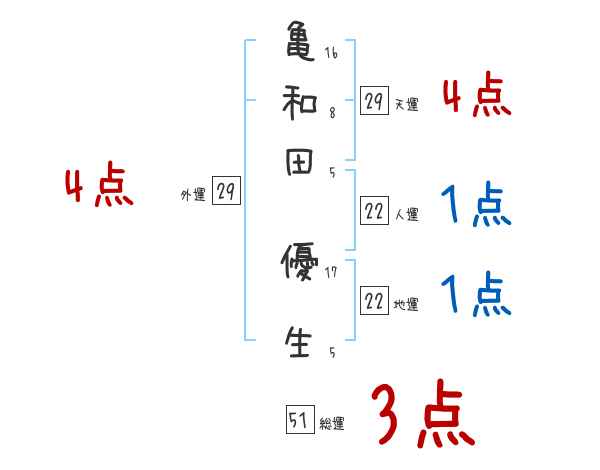 天運![]() | 亀和田優生さんの天運は29画の4つ星!完全主義で才能がある。厳格な心の持ち主。 家系が持つ宿命的な運勢を表します。祖先から受け継いだ苗字ですので自分の力が及びません。家柄を象徴します。 |