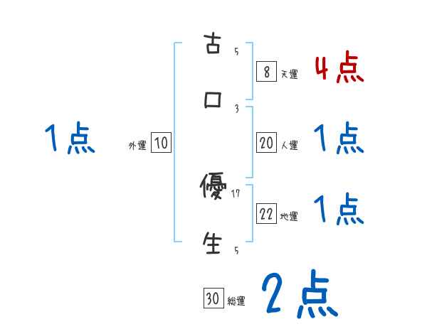 天運![]() | 古口優生さんの天運は8画の4つ星!勤勉家。根気強く努力し成功する。忍耐力がある。 家系が持つ宿命的な運勢を表します。祖先から受け継いだ苗字ですので自分の力が及びません。家柄を象徴します。 |