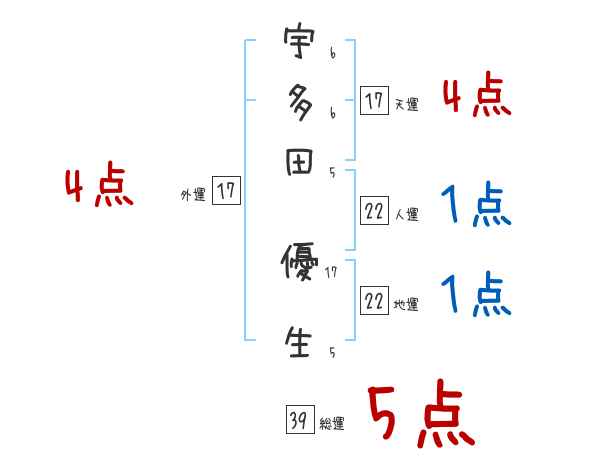 外運![]() | 宇多田優生さんの外運は17画の4つ星!積極的な行動力。地位を気づき財産を手に入れる。純粋な心と直感力。 生活面を象徴する運勢です。外部から受ける影響力を表し、結婚運、家庭運や職場、環境への順応性を表します。 |