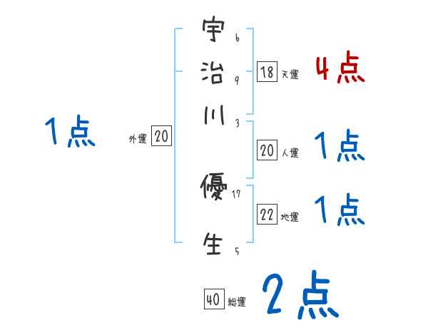 天運![]() | 宇治川優生さんの天運は18画の4つ星!情熱的で剛気。忍耐力があり信頼される。 家系が持つ宿命的な運勢を表します。祖先から受け継いだ苗字ですので自分の力が及びません。家柄を象徴します。 |