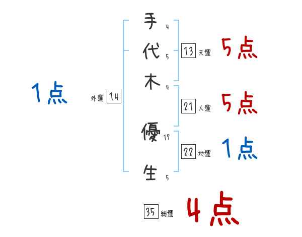 外運![]() | 手代木優生さんの外運は14画の1つ星!人に対して優しいがストレスを溜め込みがち。人間関係のトラブルを避けるよう気をつけましょう。 生活面を象徴する運勢です。外部から受ける影響力を表し、結婚運、家庭運や職場、環境への順応性を表します。 |