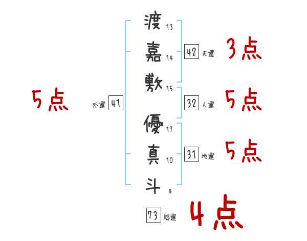 総運![]() | 渡嘉敷優真斗さんの総運は73画の4つ星!天徳のある人生。散財に注意すれば晩年幸福。 あなたの人生を表す1番重要な運勢です。生涯を通じて影響する総合運となり、主に50歳以降の晩年期に影響を及ぼします。 |
