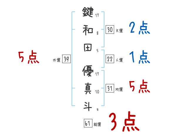 外運![]() | 鍵和田優真斗さんの外運は39画の5つ星!社交性に優れ人望が厚い。人の上に立ち成功する。 生活面を象徴する運勢です。外部から受ける影響力を表し、結婚運、家庭運や職場、環境への順応性を表します。 |