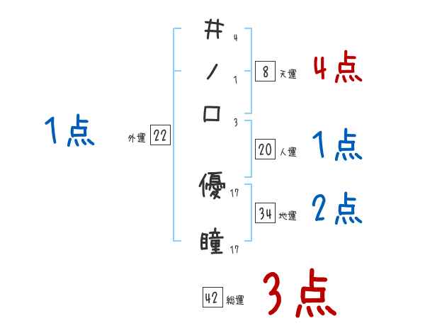 外運![]() | 井ノ口優瞳さんの外運は22画の1つ星!努力することが苦手ないっぽう手先が器用。芸術性にも優れる。 生活面を象徴する運勢です。外部から受ける影響力を表し、結婚運、家庭運や職場、環境への順応性を表します。 |