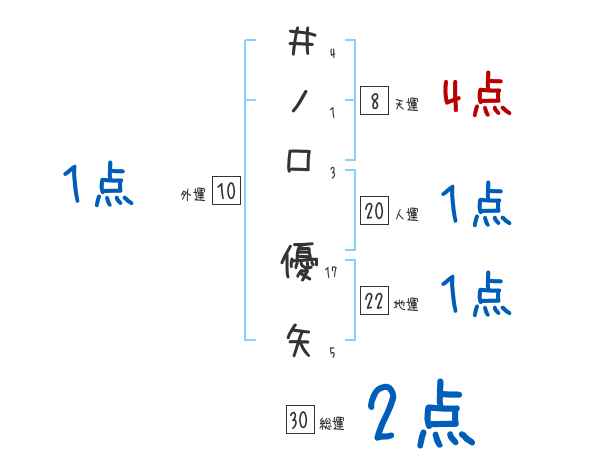 外運![]() | 井ノ口優矢さんの外運は10画の1つ星!不安を感じやすい傾向。ストレスを抱えないように注意しましょう。 生活面を象徴する運勢です。外部から受ける影響力を表し、結婚運、家庭運や職場、環境への順応性を表します。 |
