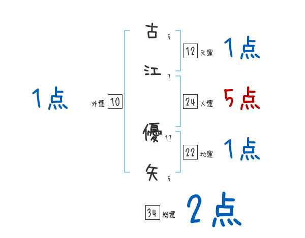 外運![]() | 古江優矢さんの外運は10画の1つ星!不安を感じやすい傾向。ストレスを抱えないように注意しましょう。 生活面を象徴する運勢です。外部から受ける影響力を表し、結婚運、家庭運や職場、環境への順応性を表します。 |