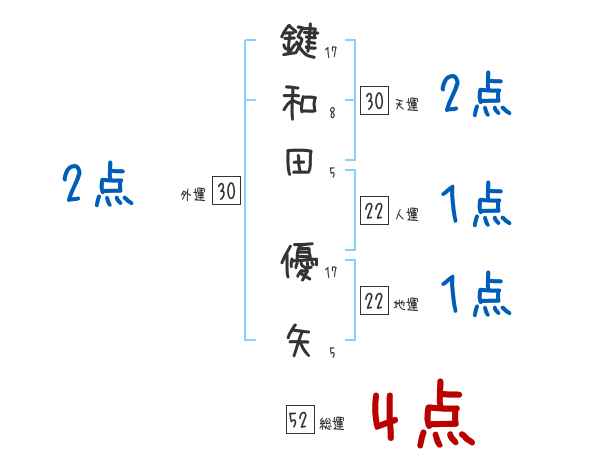 人運![]() | 鍵和田優矢さんの人運は22画の1つ星!努力することが苦手ないっぽう手先が器用。芸術性にも優れる。 性格や才能などを表す2番目に重要な運勢です。人間関係や協調性、社会的な成功に影響します。主に20歳から50歳ぐらいまでの中年期の運勢を表します。 |