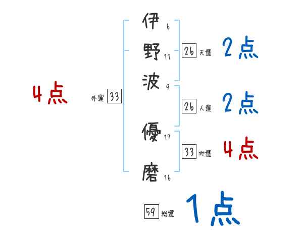 外運![]() | 伊野波優磨さんの外運は33画の4つ星!権力志向でプライドが高い。勇気があり運を切り開き成功する。 生活面を象徴する運勢です。外部から受ける影響力を表し、結婚運、家庭運や職場、環境への順応性を表します。 |