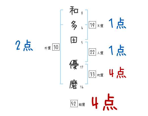 外運![]() | 和多田優磨さんの外運は30画の2つ星!浮き沈みの激しさに注意しましょう。 生活面を象徴する運勢です。外部から受ける影響力を表し、結婚運、家庭運や職場、環境への順応性を表します。 |