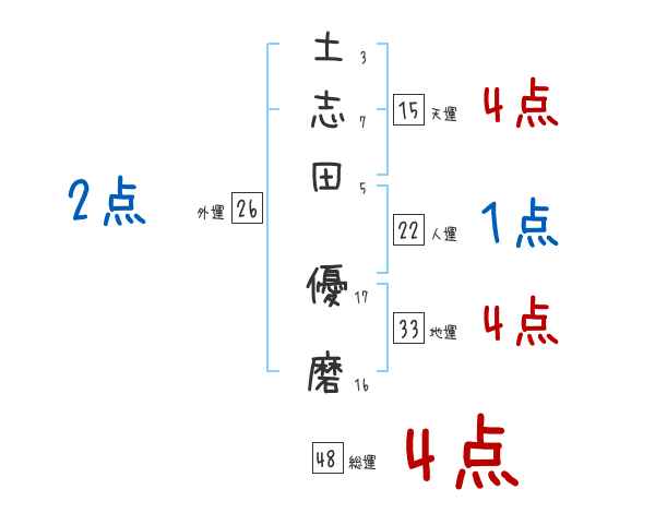 外運![]() | 土志田優磨さんの外運は26画の2つ星!波瀾万丈かも。信頼できる人を大事にしましょう。 生活面を象徴する運勢です。外部から受ける影響力を表し、結婚運、家庭運や職場、環境への順応性を表します。 |