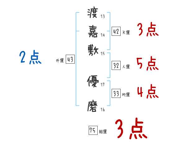 人運![]() | 渡嘉敷優磨さんの人運は32画の5つ星!柔軟性があり成功する。チャンスが多く金運が良い。 性格や才能などを表す2番目に重要な運勢です。人間関係や協調性、社会的な成功に影響します。主に20歳から50歳ぐらいまでの中年期の運勢を表します。 |