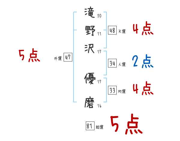 外運![]() | 滝野沢優磨さんの外運は47画の5つ星!実力が開花し発展する円満な人生。財に恵まれる。 生活面を象徴する運勢です。外部から受ける影響力を表し、結婚運、家庭運や職場、環境への順応性を表します。 |