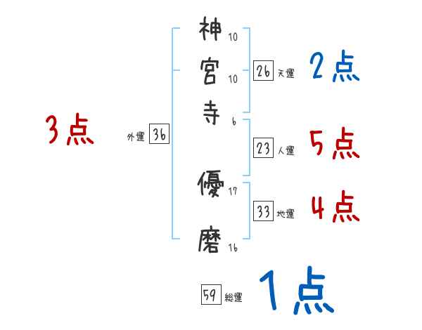 外運![]() | 神宮寺優磨さんの外運は36画の3つ星!先見性が豊かです。多少神経質で苦労することも。 生活面を象徴する運勢です。外部から受ける影響力を表し、結婚運、家庭運や職場、環境への順応性を表します。 |