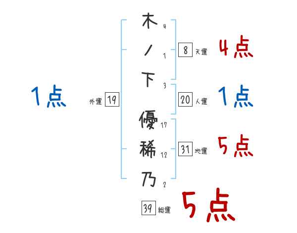 外運![]() | 木ノ下優稀乃さんの外運は19画の1つ星!優れた才能を持ちますが、協調性が足りないことも。周りの人と協力する事を意識しましょう。 生活面を象徴する運勢です。外部から受ける影響力を表し、結婚運、家庭運や職場、環境への順応性を表します。 |