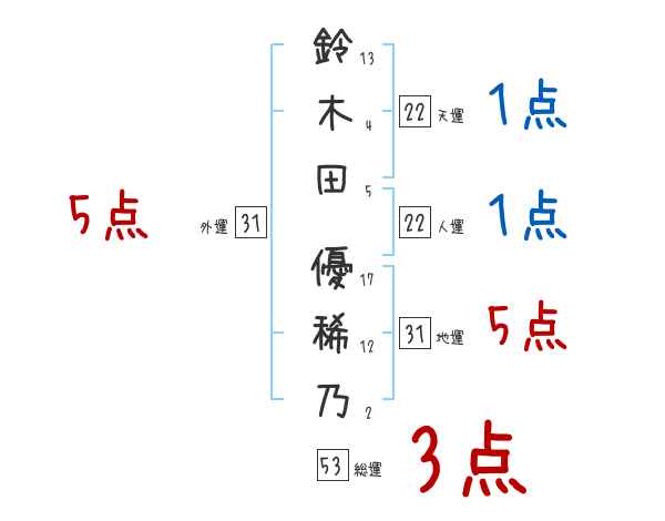 総運![]() | 鈴木田優稀乃さんの総運は53画の3つ星!やや見栄っ張りで虚栄心がある。散財に注意。 あなたの人生を表す1番重要な運勢です。生涯を通じて影響する総合運となり、主に50歳以降の晩年期に影響を及ぼします。 |