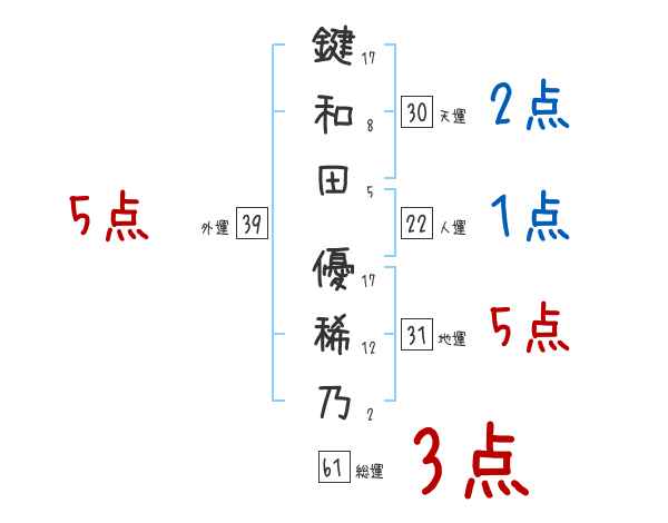 外運![]() | 鍵和田優稀乃さんの外運は39画の5つ星!社交性に優れ人望が厚い。人の上に立ち成功する。 生活面を象徴する運勢です。外部から受ける影響力を表し、結婚運、家庭運や職場、環境への順応性を表します。 |